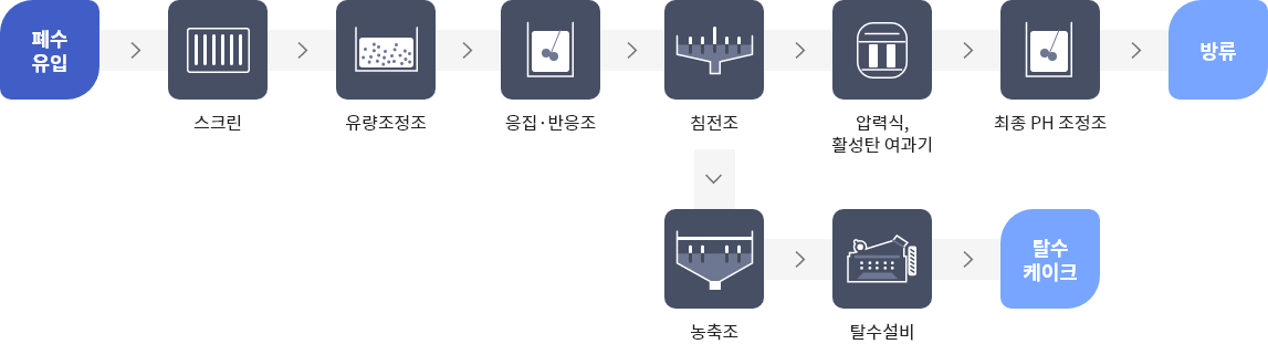 폐수유입 → 스크린 → 유량조정조 → 응집·반응조 → 침전조 → 농축조 → 탈수설비 → 탈수케이크