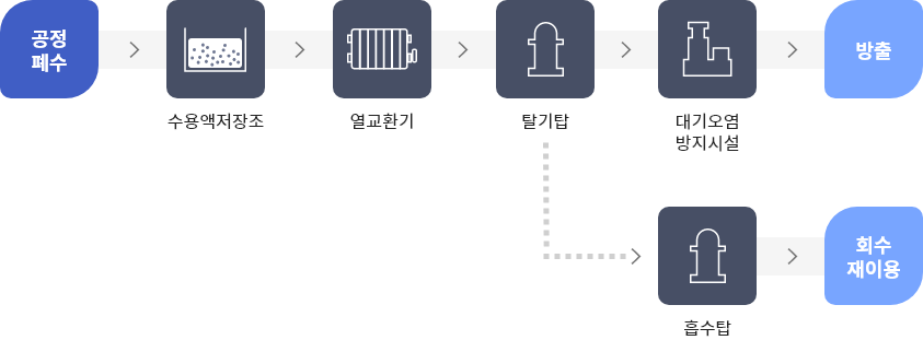 공정폐수 → 수용액저장조 → 열교환기 → 탈기탑 → 대기오염 방지시설 → 방출