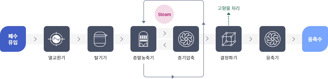폐수유입 → 열고환기 → 탈기기 → 증발농축기(순환) → ← 증기압축 → 결정화기 → 응축기 → 응축수