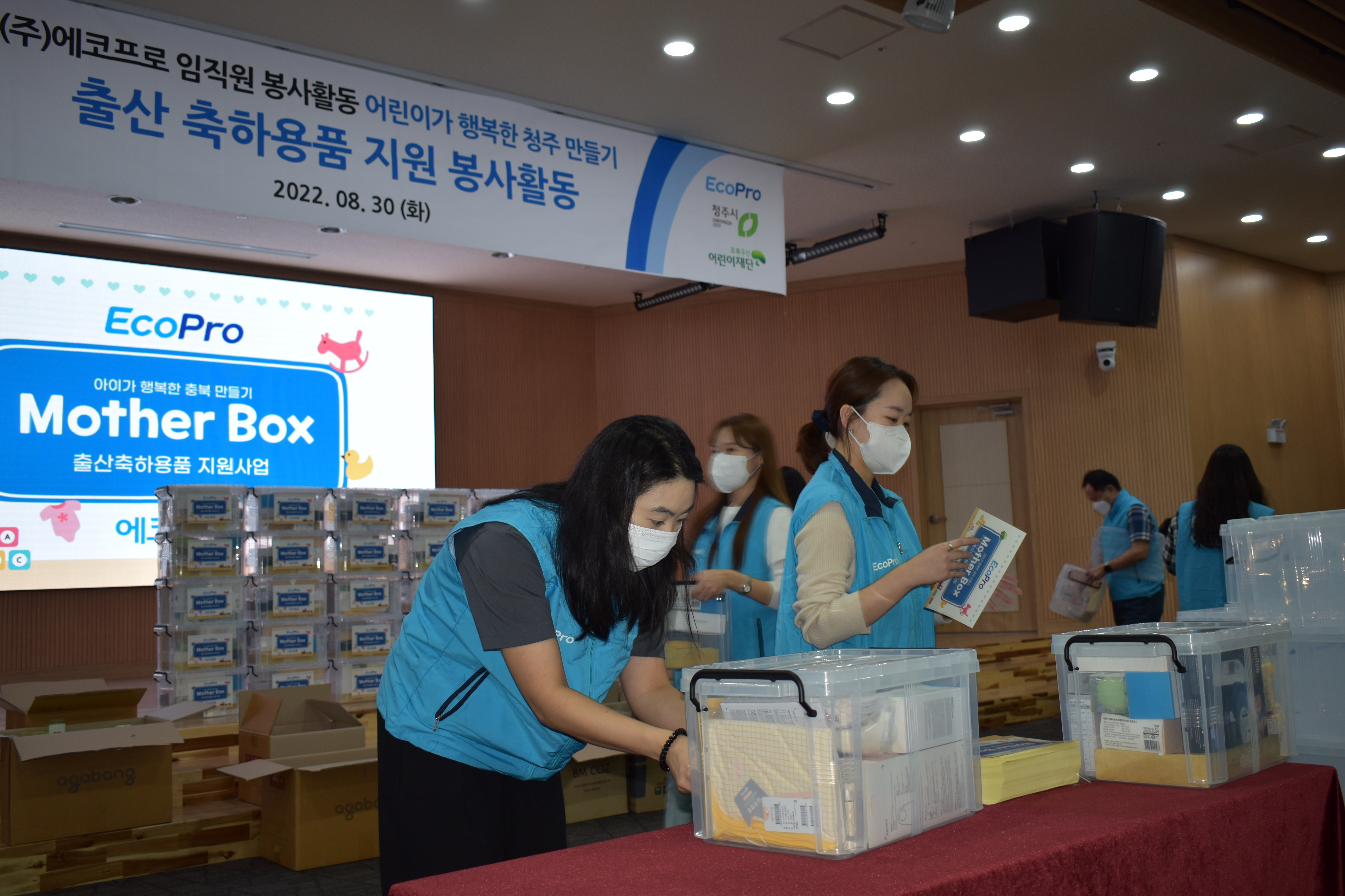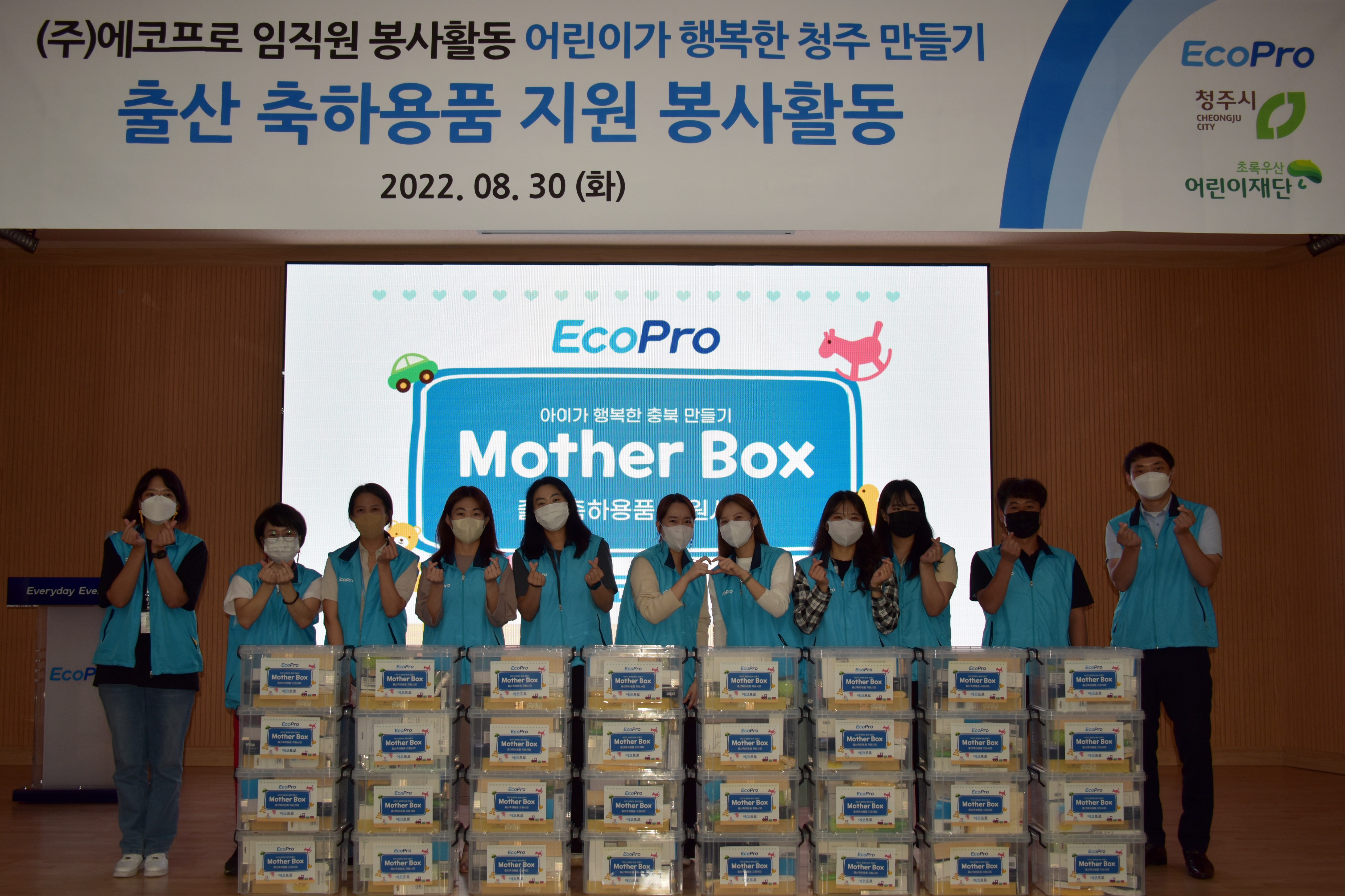 2022년 8월 30일, 에코프로는 지역 내 저출산 문제를 극복하고 건강한 육아를 응원하기 위해 청주시 내 취약계층 출산 가정 150가구에 마더박스를 전달했습니다.