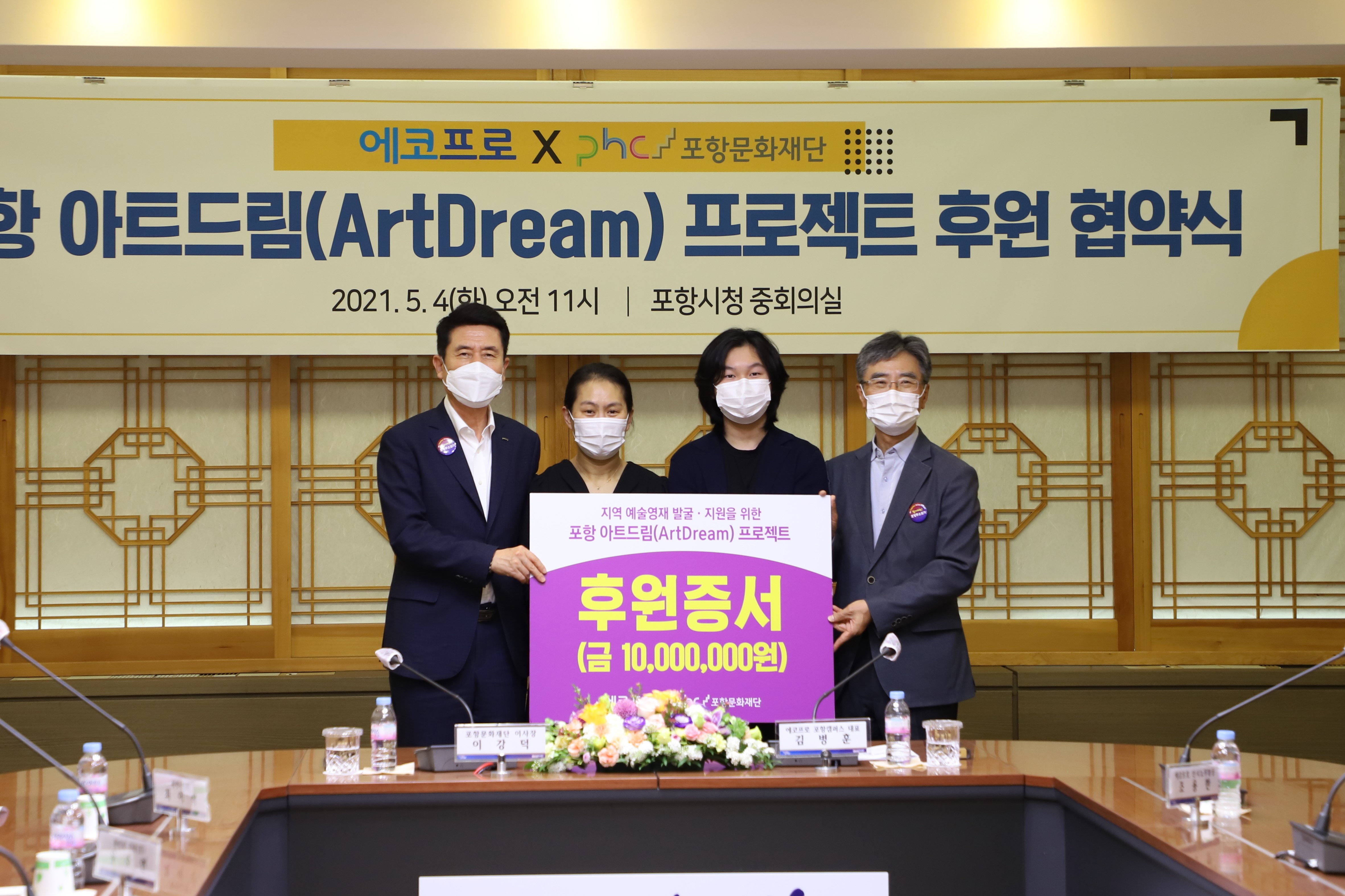 2021년 5월 4일, 에코프로가 포항 문화재단과 예술 영재 발굴 및 후원을 위한 '포항 아트드림 프로젝트' 업무협약을 맺었습니다.