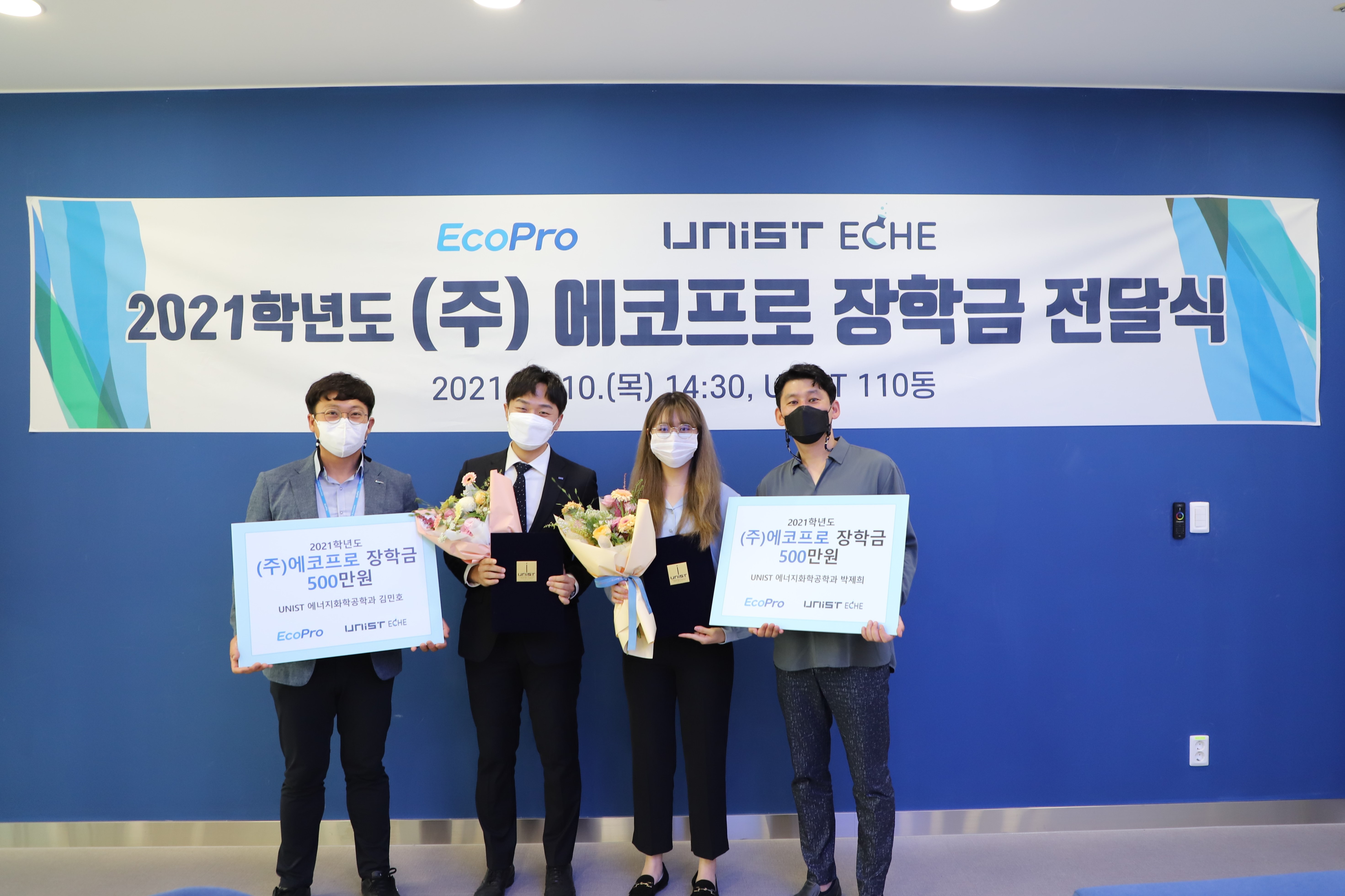 2021년 6월 10일, 에코프로는 UNIST 배터리분야를 전공하는 에너지화학공학과 대학원생들을 위해 1천만원을 전달하였습니다. 이외에도 에코프로 포항캠퍼스가 위치한 영일만산단 인근의 포항대학교에 주문식 교육장학금, 당사의 입사 지원률이 높은 제철공업고등학교에 시설지원금 각 1천만원을 전달하기도 하였습니다.