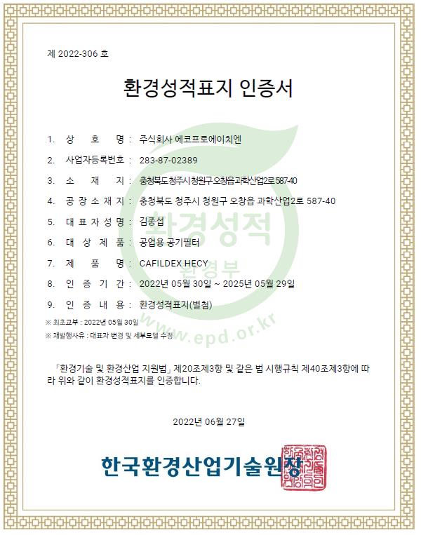 [뉴스]에코프로에이치엔, 케미컬필터 업계 최초 '환경성적표지 인증' 획득 2022.07.14