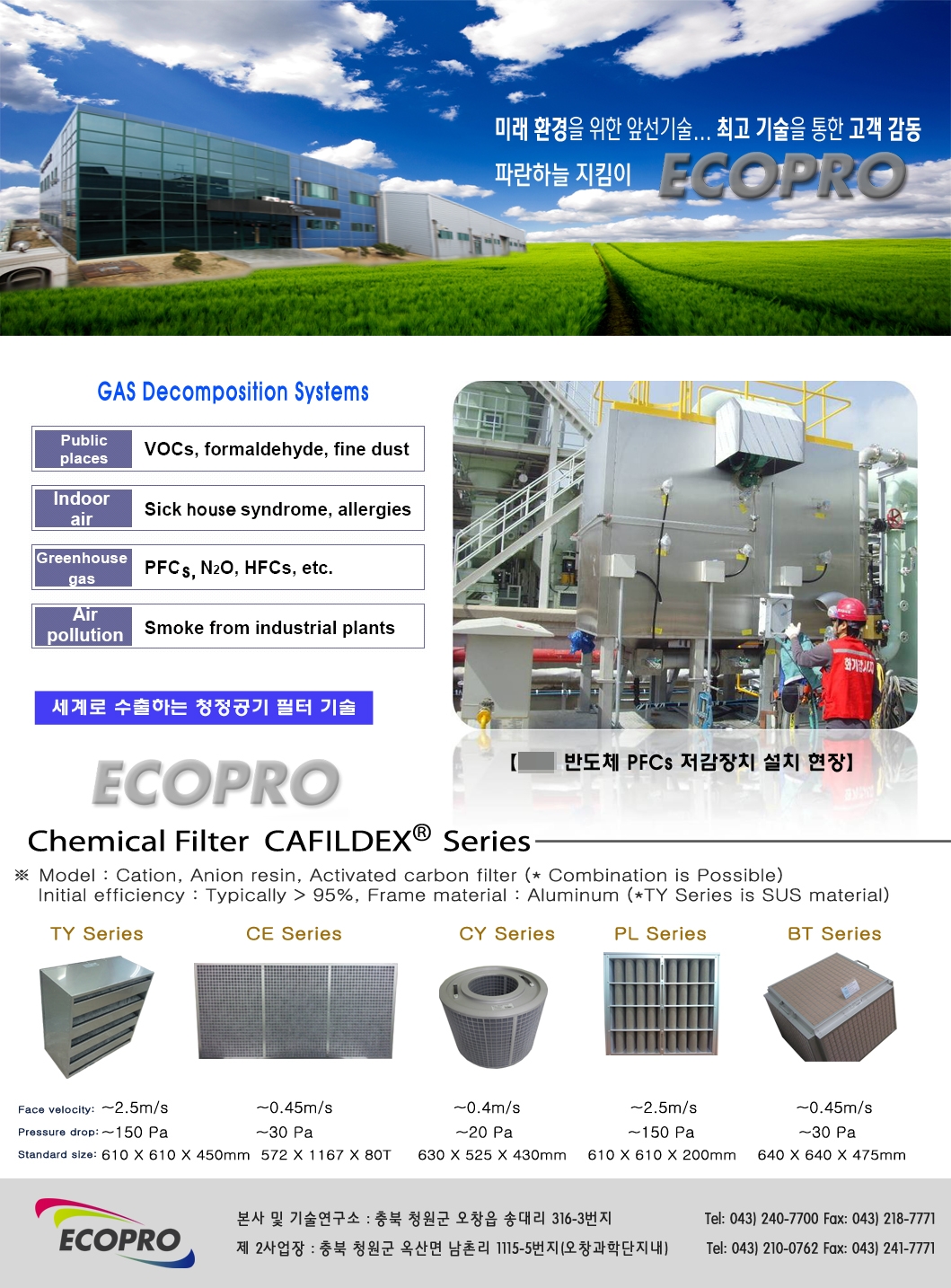 ECOPRO 제품 화학필터는 현재 국내 최고의 기업들과 해외로 수출되고 있으며, 반도체 공정 및 각종 산업가스 및 기타 유해 가스를 제거해 주며, 온실가스 감축 설비 역시 국내 최고의 기업 A사에 2년간의 Test 를 거쳐 납품되어 운행중에 있습니다.
