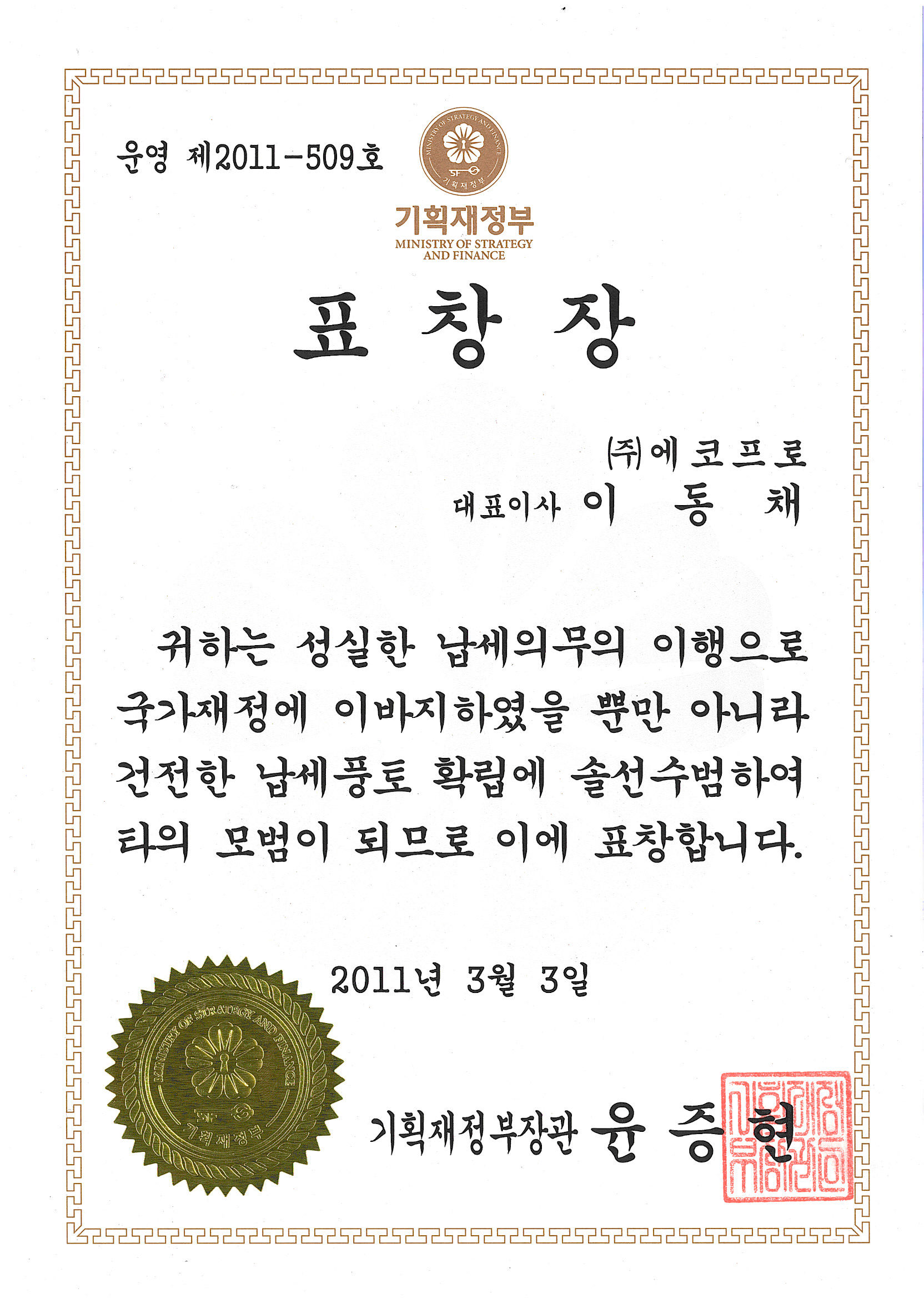 금일 수상한 표창장(기획재정부 장관)입니다.