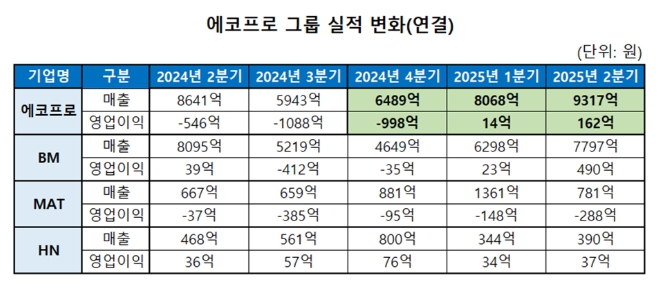 에코프로는 2분기 연결기준 매출 9317억 원, 영업이익 162억 원을 기록했다고 6일 밝혔다. 매출은 전 분기 8068억 원 대비 15% 늘었고 영업이익은 전 분기(14억 원) 대비 148억 원 증가했다. 매출과 영업이익은 3개 분기 연속 늘었으며 영업 흑자 기조는 올해 1분기에 이어 2분기에도 이어졌다.