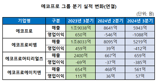 [뉴스]에코프로 3분기 매출 5943억, 영업이익 마이너스 1088억 기록 2024.11.01